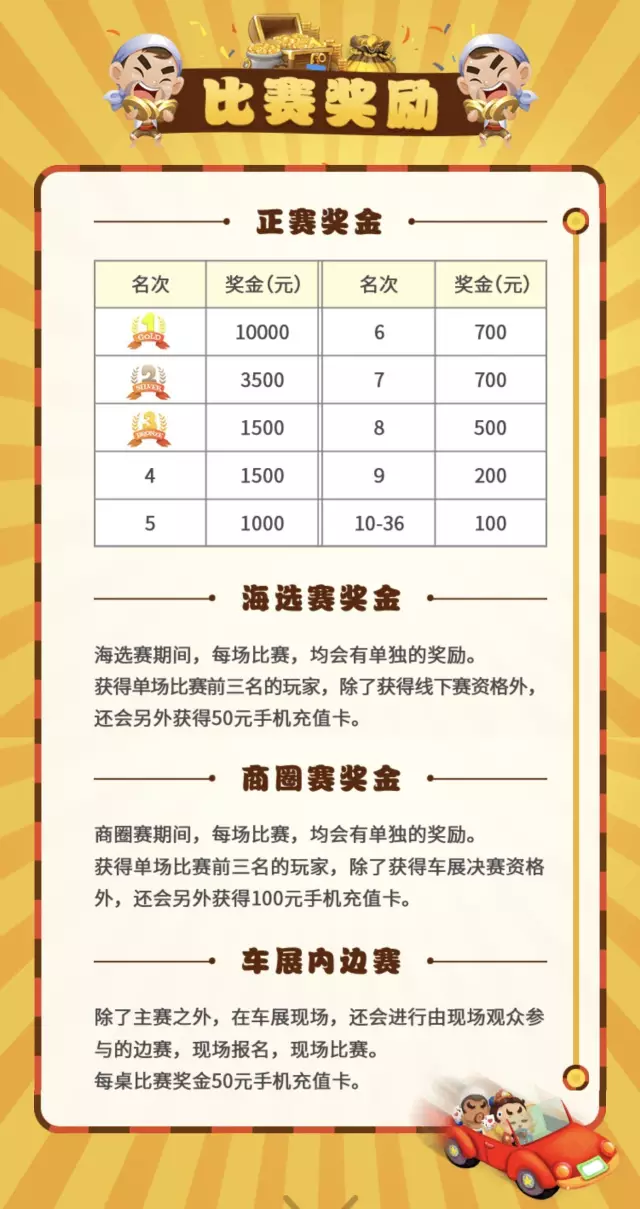 决赛于2017年5月1日东莞国际车展现场精彩呈现,;其中设立了丰厚的奖金——获得个人赛第一名的选手将赢取高达10,000元奖金;除了最高奖金,第二至五名将奖励1000-3500元,三至三十六名将获奖金100-700元,且参与海选赛、商圈赛、车展内边赛的选手,均可额外获得50-100元手机充值卡。
